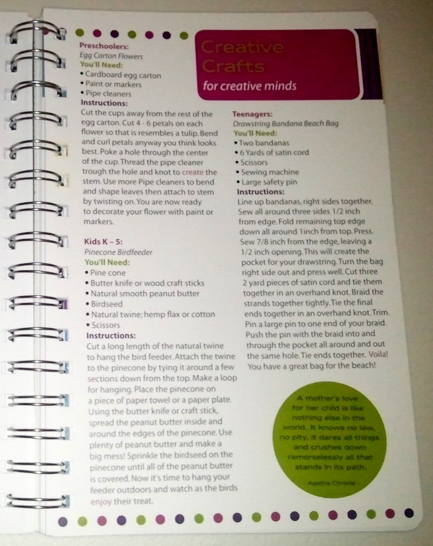 I was sent a Mom’s Manager Wall Calendar as well as the convenient purse-sized Mom’s Manager for review. I’ve always loved paperwork and list-making so I was delighted to put my penmanship and creativity to the test. There is something wonderful about writing with colorful pens on a new calendar that technology for organization (such as cell phones and computers) can’t provide.